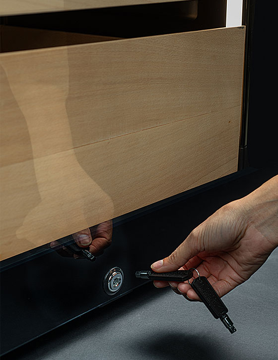 - Uitgevoerd met 1 houten legger, 1 presentatielegger, 2 multipositie-leggers, 1 halve legger, 1 lade, uitschuifbaar via telescopische rails + 1 vaste lade.